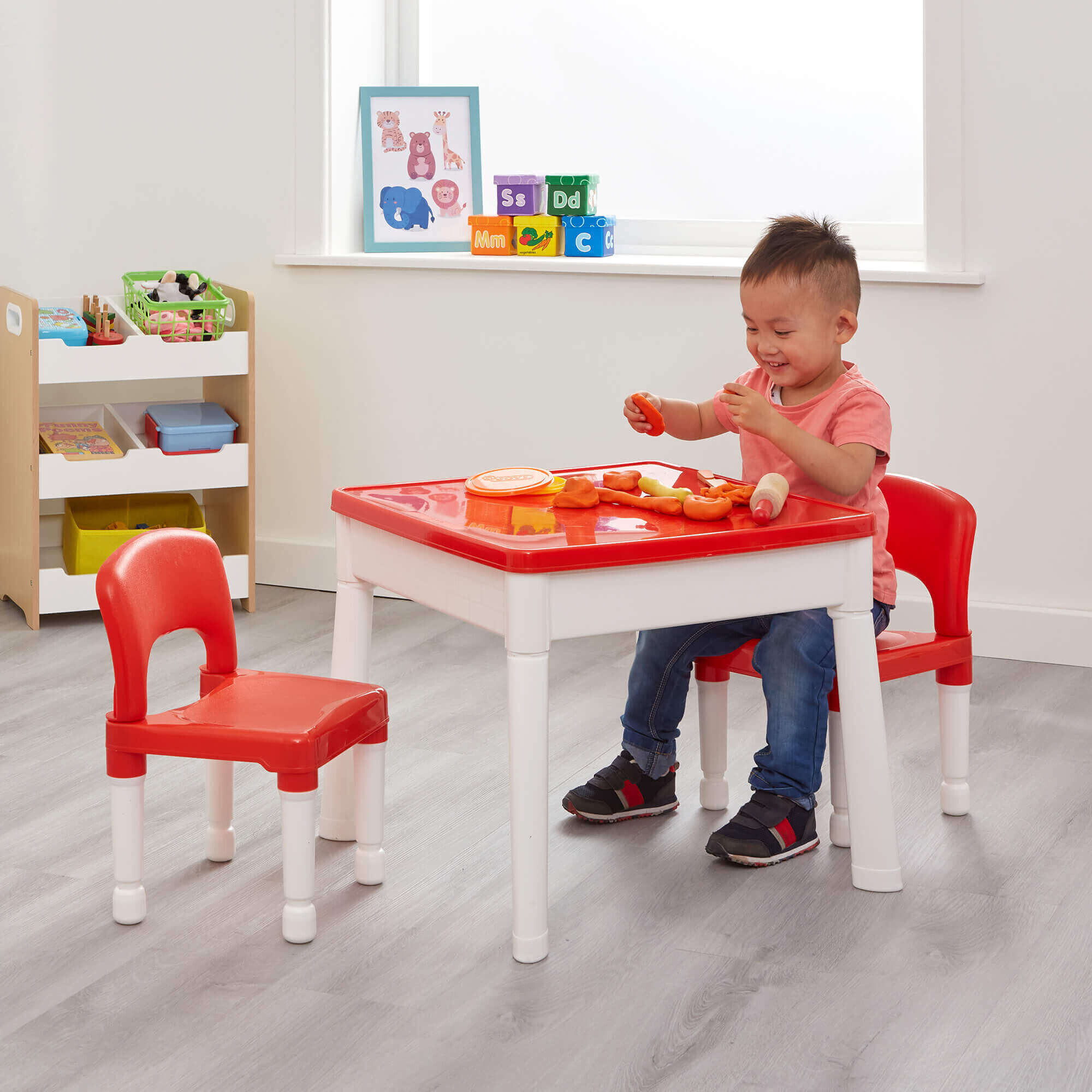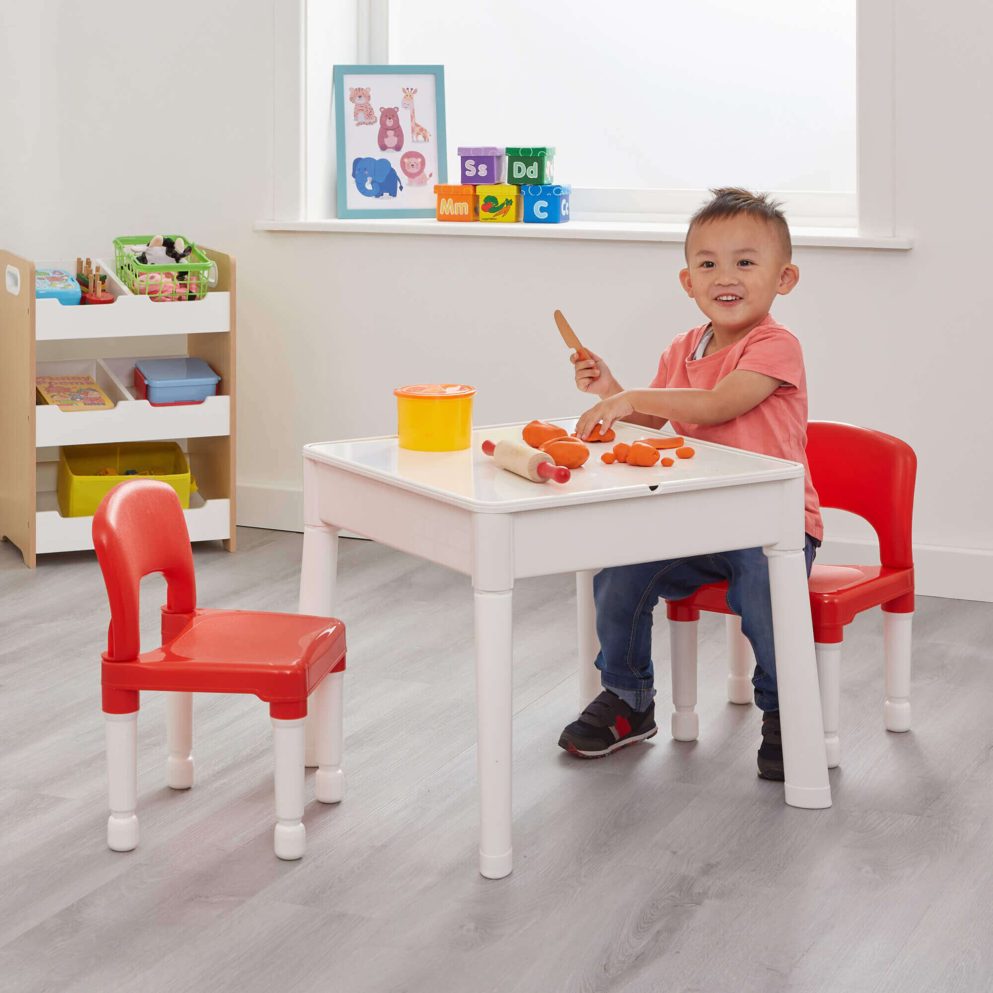 Ein Mehrzweck-Spieltisch, der sowohl Stauraum als auch Aktivität kombiniert und ideal für jüngere Kinder ist. Der Tisch wird mit einer roten Spielplatte geliefert (die auch als Abdeckung dient) - eine glatte Oberfläche, die zum Essen, Lesen und Zeichnen geeignet ist. Unter dem Spieloberteil wird eine zweiseitige Kreide- und Trockenwischoberfläche geliefert und aufbewahrt, die sich perfekt für Kunst und Markierungen eignet. Für die ersten Jahre ist das Markieren ein wichtiges Stadium bei der Entwicklung der körperlichen und kreativen Fähigkeiten eines Kindes. Es ist auch ein wichtiger erster Schritt beim Erlernen des Schreibens. Der Aufbewahrungsbereich kann für Spielzeug, Spiele usw. verwendet werden, eignet sich aber auch zum Spielen mit Sand oder Wasser, ideal für die taktile und sensorische Entwicklung eines Kindes. Geeignet für den Innen- und Außenbereich (trockene Wisch- / Tafeloberflächen sollten jedoch im Innenbereich aufbewahrt werden).