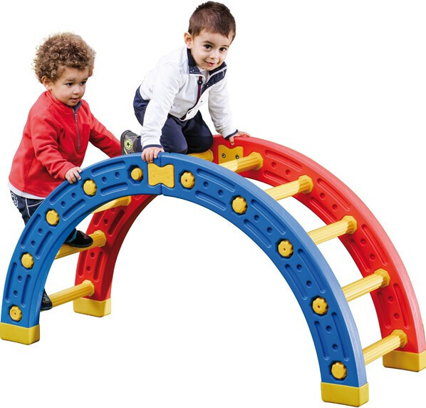 Die mitgelieferte Brücke ermöglicht die stabile Verbindung mit anderen Spielmodulen, wie z. B. einem Kletterdreieck. Das Balancier-Rad wird zerlegt geliefert, mit Werkzeug für die einfache Montage.