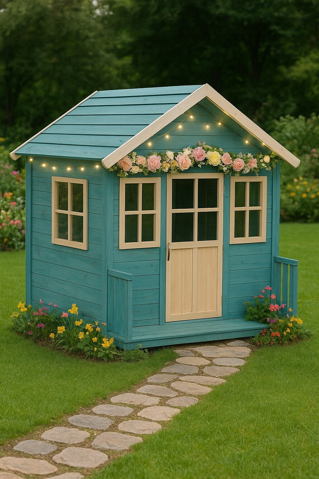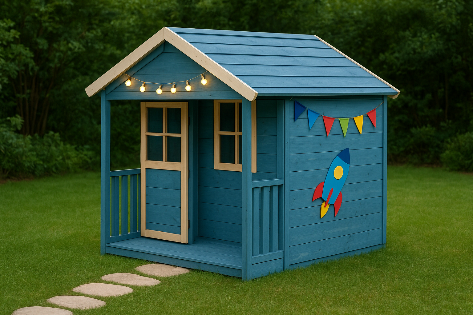 Das Deckhouse Holzspielhaus bietet Kindern einen eigenen Rückzugsort zum Spielen, Entspannen und Geschichten erfinden. Mit seiner stilvollen Teal-Farbe, weißen Akzenten und einer kleinen Veranda ist es ein echter Blickfang im Garten.