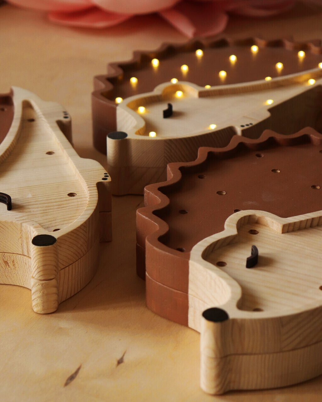 Entdecken Sie diese wunderschöne handgefertigte hölzerne Nachtlampe mit LED-Beleuchtung, perfekt für jedes Kinderzimmer. Die Lampe vereint Raffinesse mit inspirierenden Formen und fügt sich nahtlos in verschiedene zeitgenössische Einrichtungsstile ein, um jedem Raum genau die richtige Menge Charme zu verleihen.