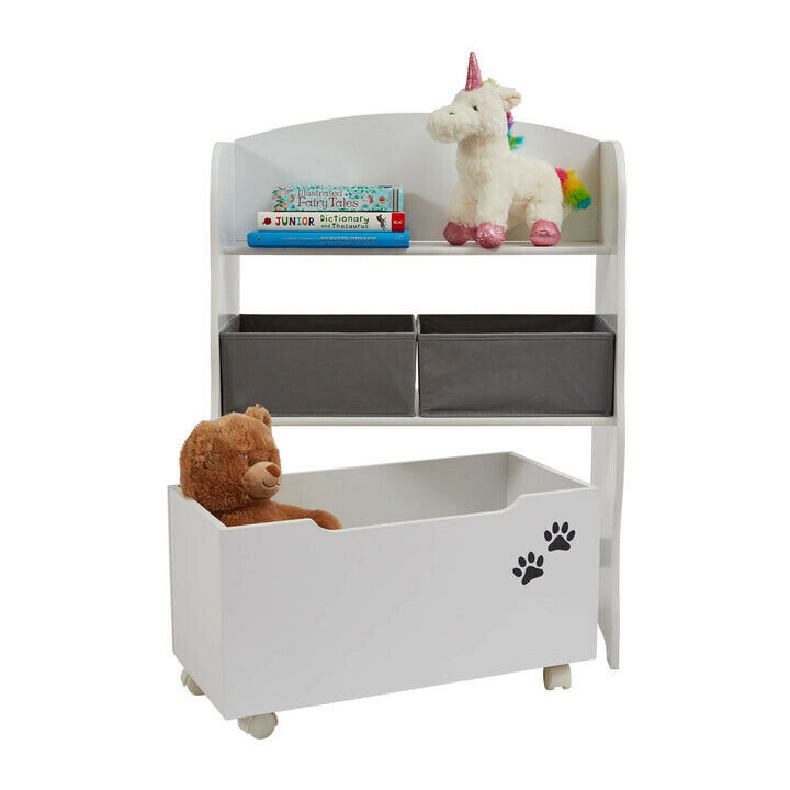 - Diese Einheit umfasst 2 Regale, 2 Aufbewahrungsboxen aus Stoff und eine ausrollbare Spielzeugkiste. Aufgrund seiner Vielzahl an Aufbewahrungsmöglichkeiten ist dies ein wichtiges Möbelstück für den Raum Ihres Kindes.