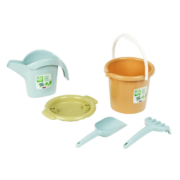 Zusatzinformation: Kinderstrandeimer - Sandkastenset - Strandspielzeug - Outdoor-Spielzeug - Eimer - Schaufel - Rechen - Gießkanne - Hergestellt aus biologischem Kunststoff in der EU