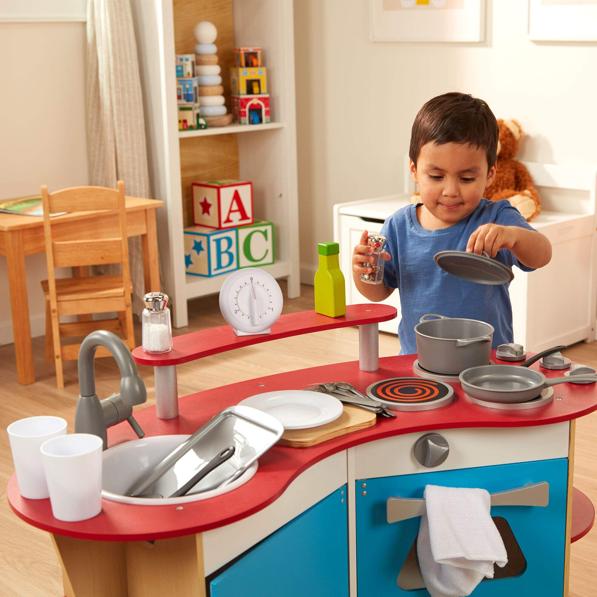 Mit einer herausnehmbaren Spüle, einem 3-flammigen Herd mit klickenden Knöpfen, einem Ofen, Kühlschrank, geräumigen Ablageflächen und sogar einem funktionierenden Timer erleben Kinder realitätsnahes und lehrreiches Spielen.