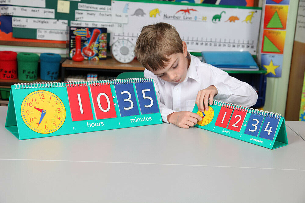Unterrichten Sie effektiv analoge und digitale Zeit mit diesen freistehenden Flipcharts, die das 12-Stunden-Zifferblatt und die Zahlen für die 24-Stunden- oder 12-Stunden-Digitalzeit zeigen. Das Zifferblatt hat bewegliche, farbcodierte Zeiger, die es Kindern leicht machen, die Zeiger auf dem Zifferblatt und die Zeit auf dem Flipchart zu koordinieren.