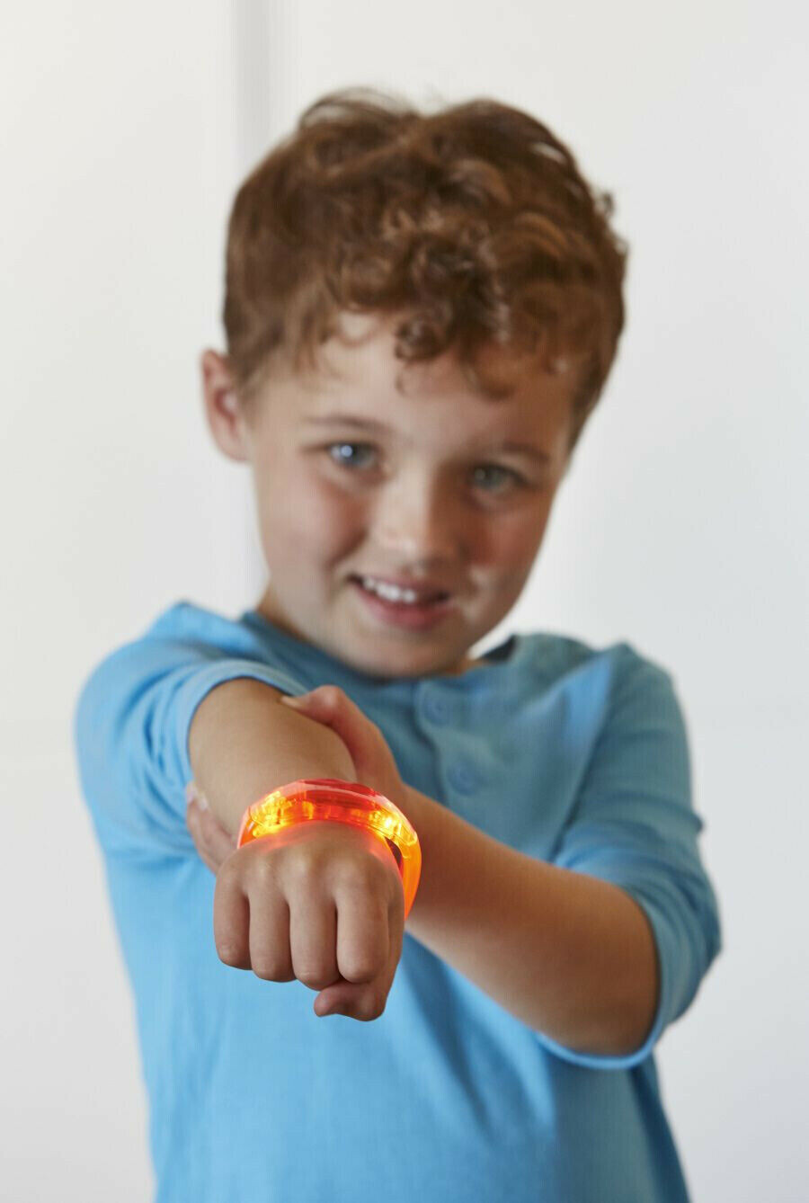 Ein LED-Soft-Gel-Armband, das in drei verschiedenen Programmmodi hell leuchtet; Schneller Blitz, langsamer Blitz und an. Geeignet für Kinder ab 3 Jahren Benötigt 4 x AG3-Batterien (im Lieferumfang enthalten) Größe: 60 mm Innendurchmesser