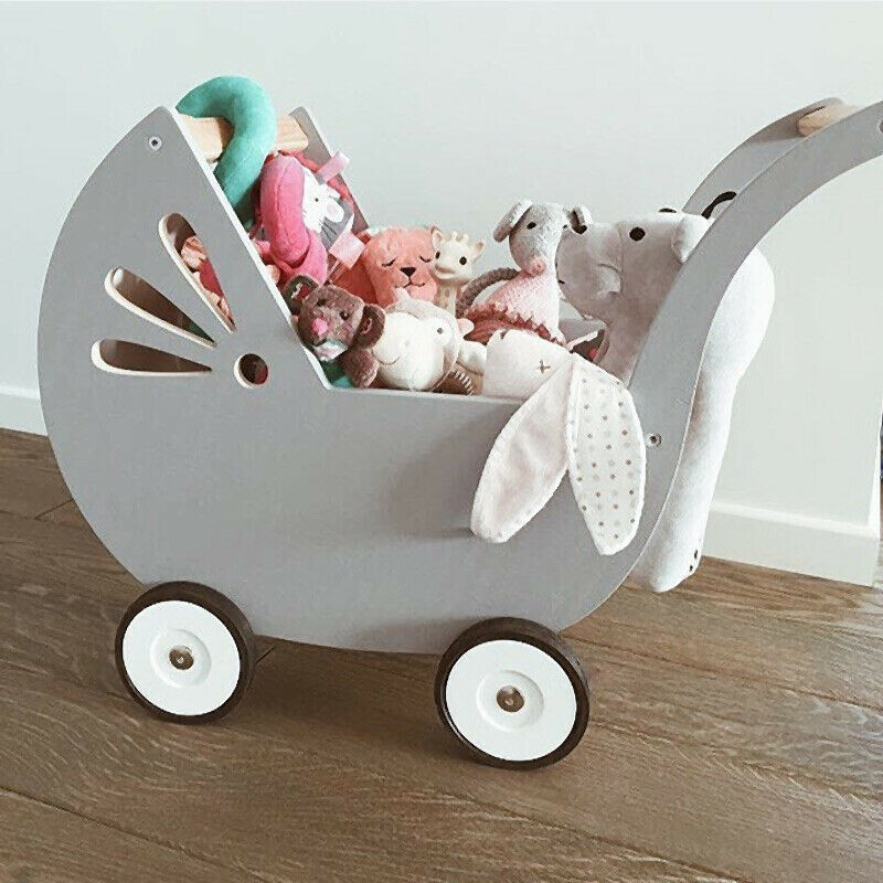 Charmanter Puppenwagen aus Holz, mit großer Sorgfalt entworfen und hergestellt, freundlich und sicher für Kleinkinder.