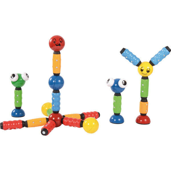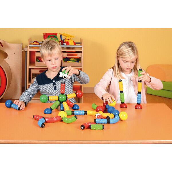 Gestalten Kinder aus den magnetischen Sticks, Halbkugeln, Augen und Kugeln - teilweise mit Gesichtern. Die verschiedenen Oberflachenstrukturen fordern die sensorische Entwicklung.