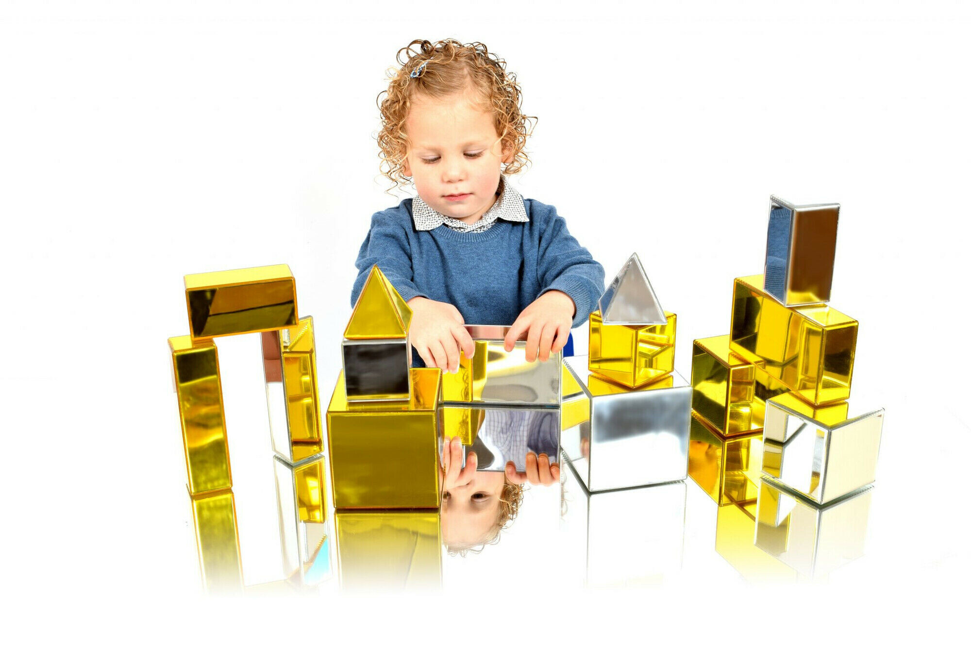 Dieses schöne Set aus 14 Würfeln, Pyramiden und Blöcken in Gold- und Silbermetallic (Kunststoff) wird die Fantasie Ihres Kindes stundenlang anregen und mit seiner Hochglanzoberfläche anregen.