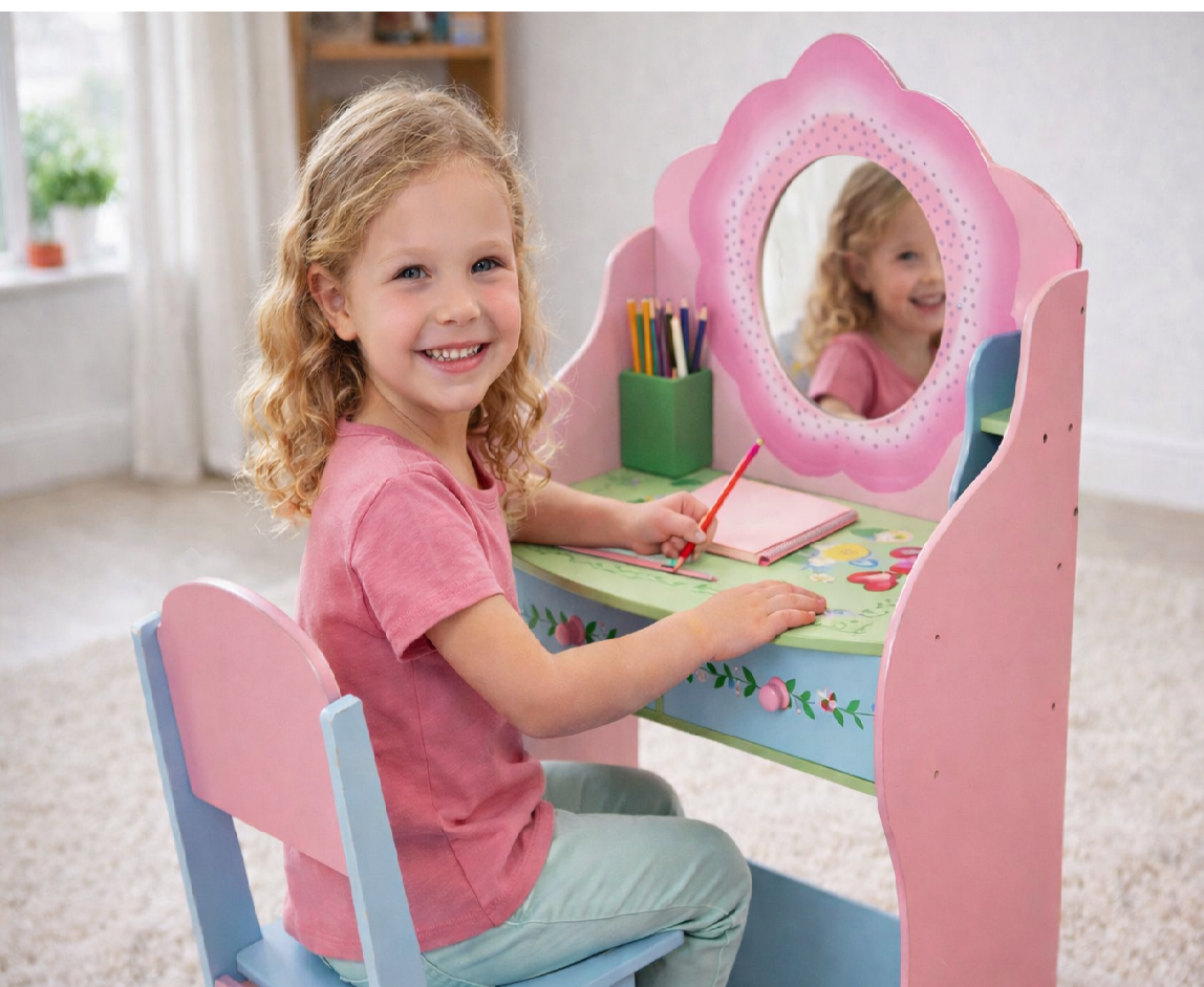 Der Fairy Kinder-Schminktisch mit Stuhl ist ein pädagogisches Holzmöbel, das die kindliche Entwicklung durch Rollenspiel und Selbstständigkeit unterstützt. Liebevoll handgemalte Feen- und Blumenmotive schaffen eine ruhige, einladende Umgebung für Zuhause, Kindergarten, Schule oder Therapie.