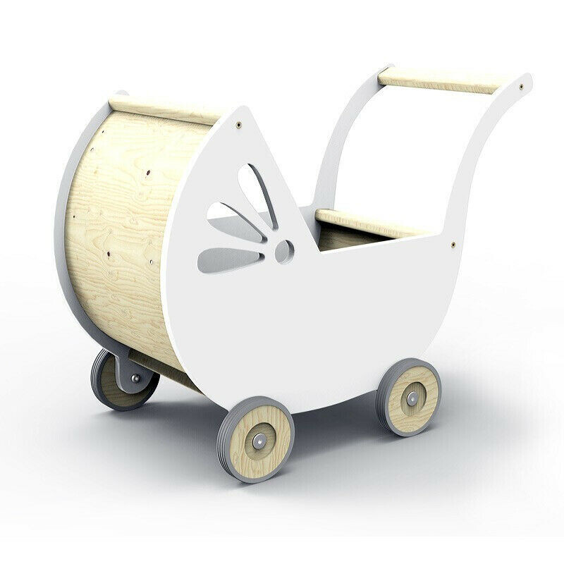 Charmanter Puppenwagen aus Holz, mit großer Sorgfalt entworfen und hergestellt, freundlich und sicher für Kleinkinder.