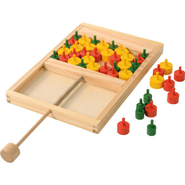 Der Federschieber halt die Spielsteine komprimiert im Holzrahmen. Wer kann die meisten Spielsteine herausnehmen, ohne dass sich der Schieber bewegt? Ziel ist es, moglichst viele Spielstein-Punkte zu sammeln. Das Spiel ist für 1-4 Kinder geeignet. Es fordert Feinmotorik, logisches Denken und die Auge-Hand-Koordination.