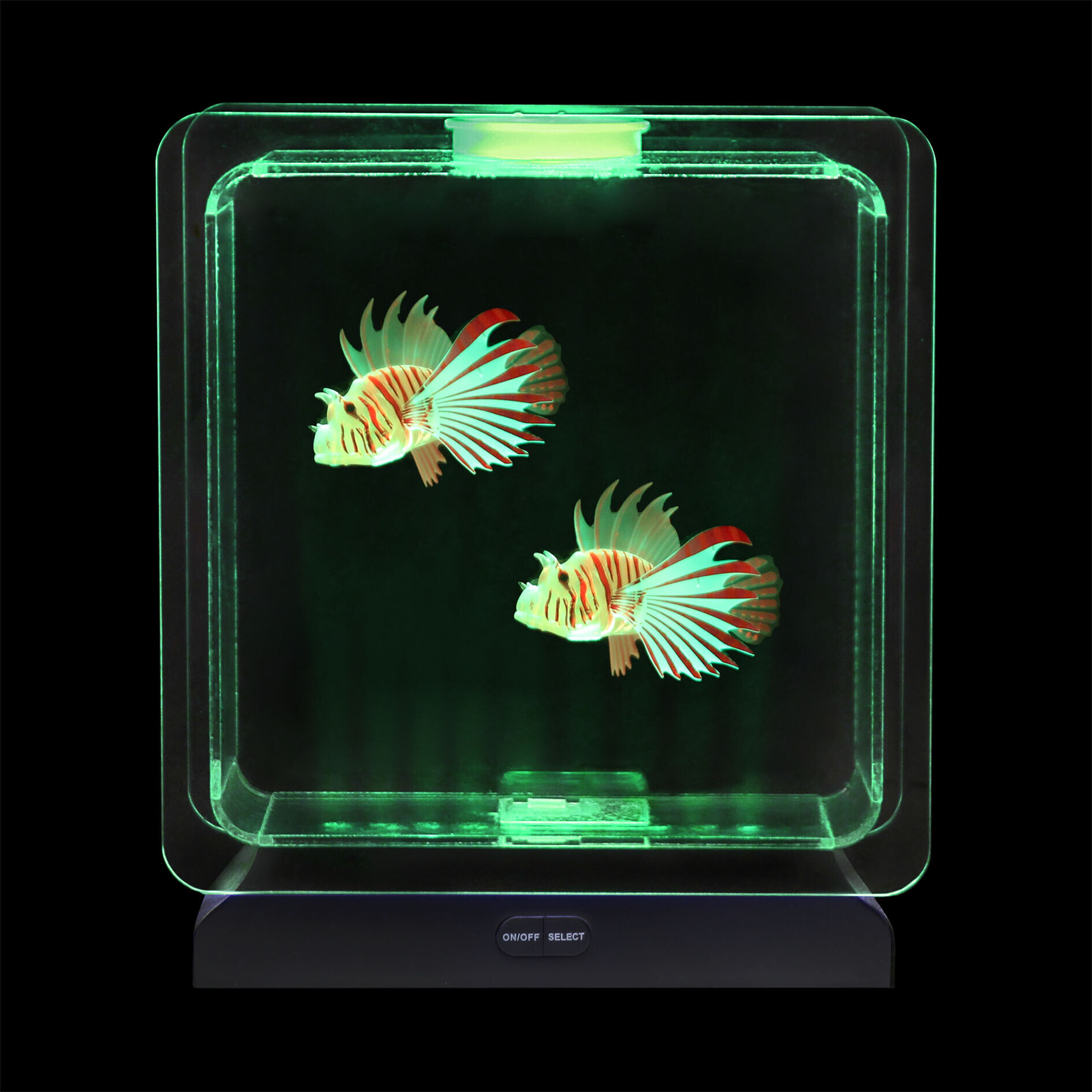 Zwei lebensechte tropische Fische schwimmen anmutig im beleuchteten Wasser und schaffen eine realistische Unterwasserwelt, die Kinder und Erwachsene gleichermaßen begeistert. Die sanften LED-Farbwechsel fördern emotionale Ausgeglichenheit, Fokus und Gelassenheit.