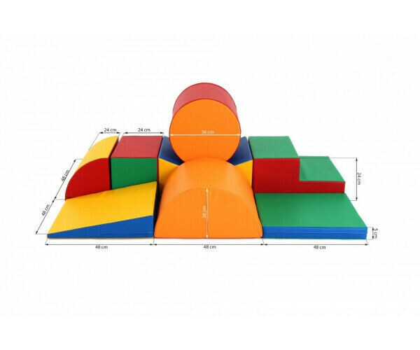 Bei diesem Softplay Schaumstoff-Spielklötzchen-Set XL sind die Schaumstoffklötze nicht 40, sondern 48 cm breit , und die Blöcke sind höher als im Set 7 . Der Zylinder hat einen Durchmesser von 36 cm und ist 48 cm breit, Kinder können wunderbar darüber rollen.