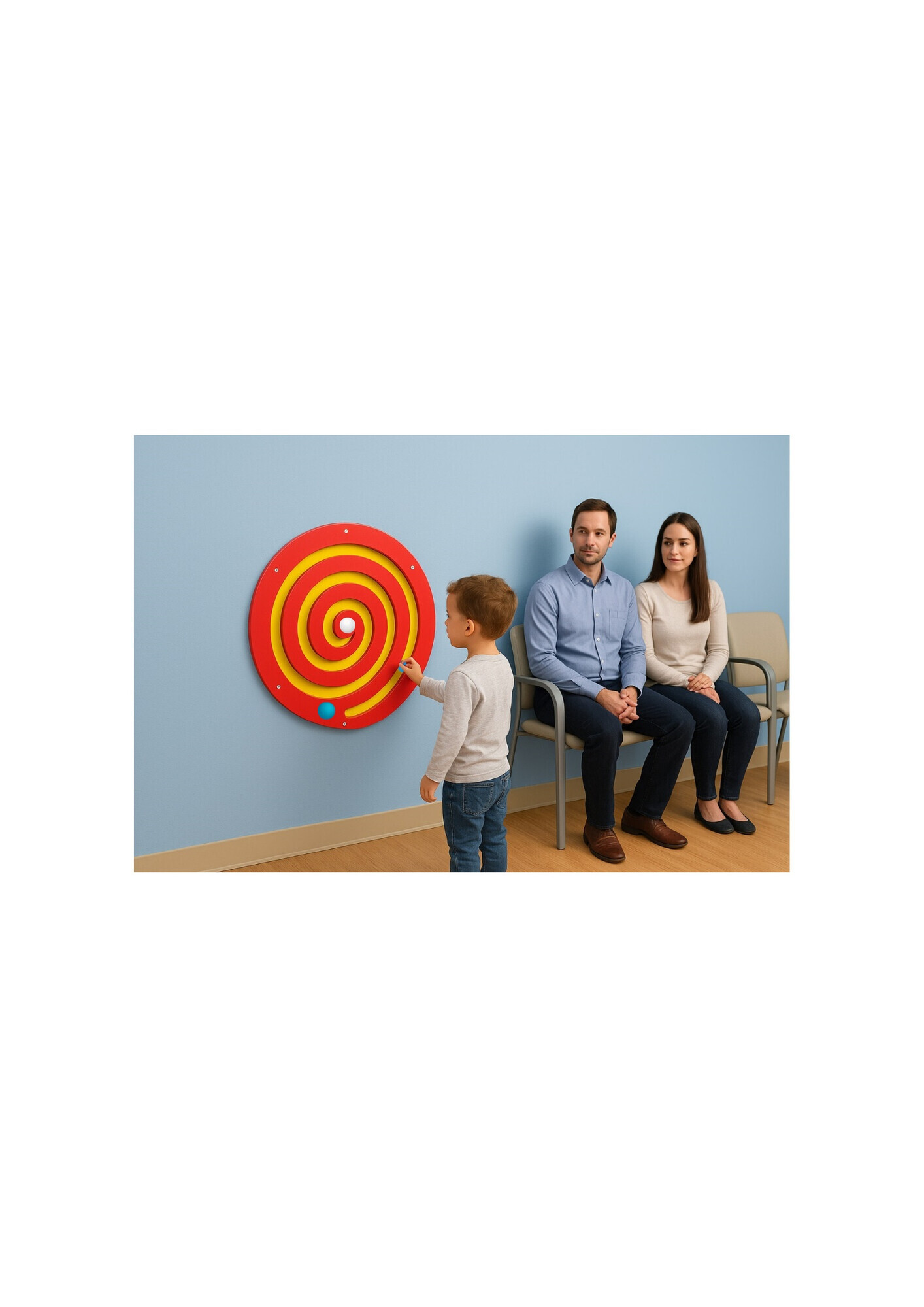 Das Wandpaneel Kugelspirale Rot ist ein spannendes und wartungsfreies Wandspiel, das Kinder dazu herausfordert, die integrierte Holzkugel durch eine Spiralbahn in die Mitte zu führen. Durch das Drehen des Paneels um die Metallachse bewegt sich die Kugel kontrolliert zum Zentrum. Sobald sie das Ziel erreicht, rollt sie automatisch zurück – für endlosen Spielspaß!